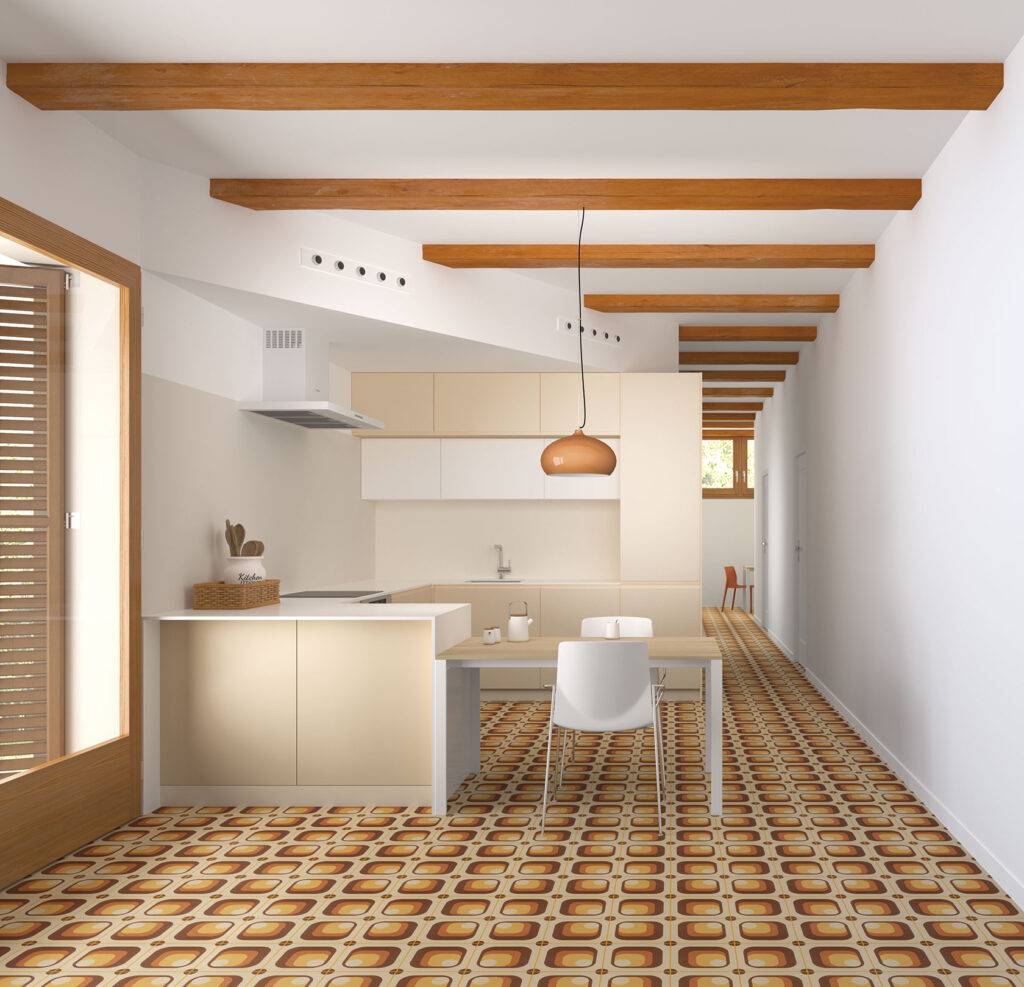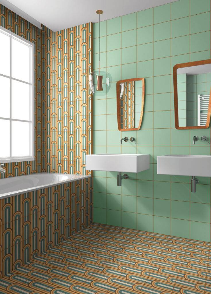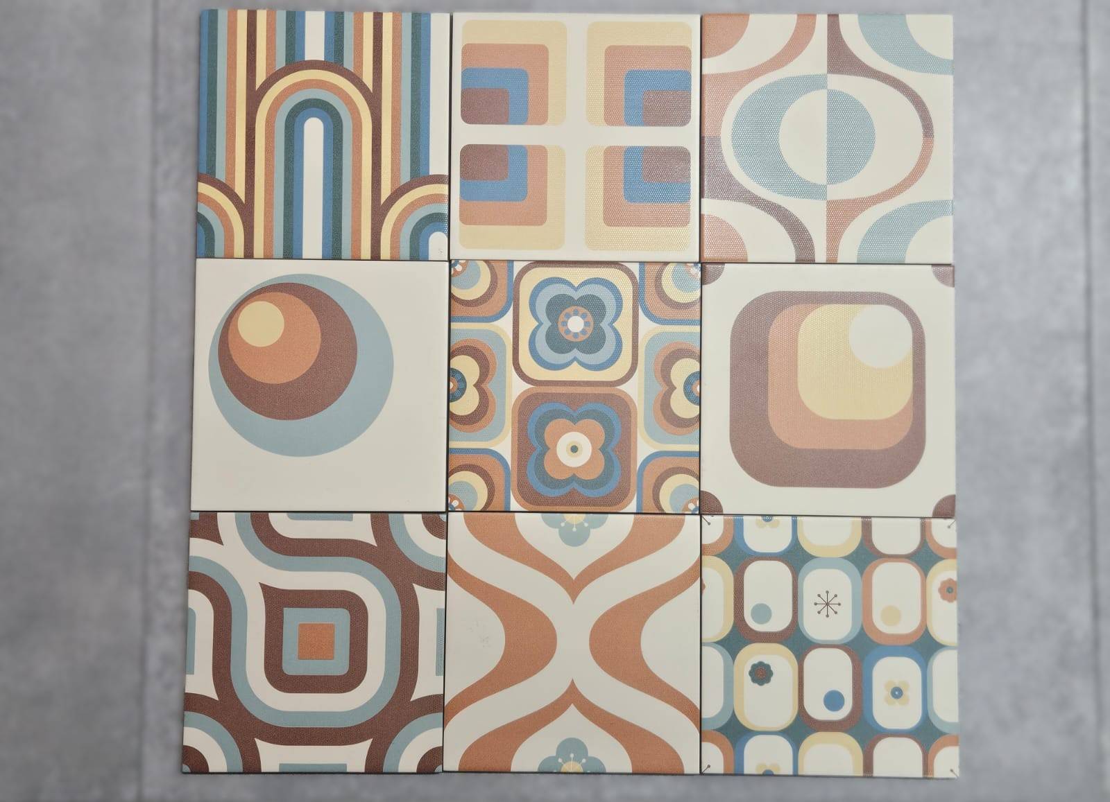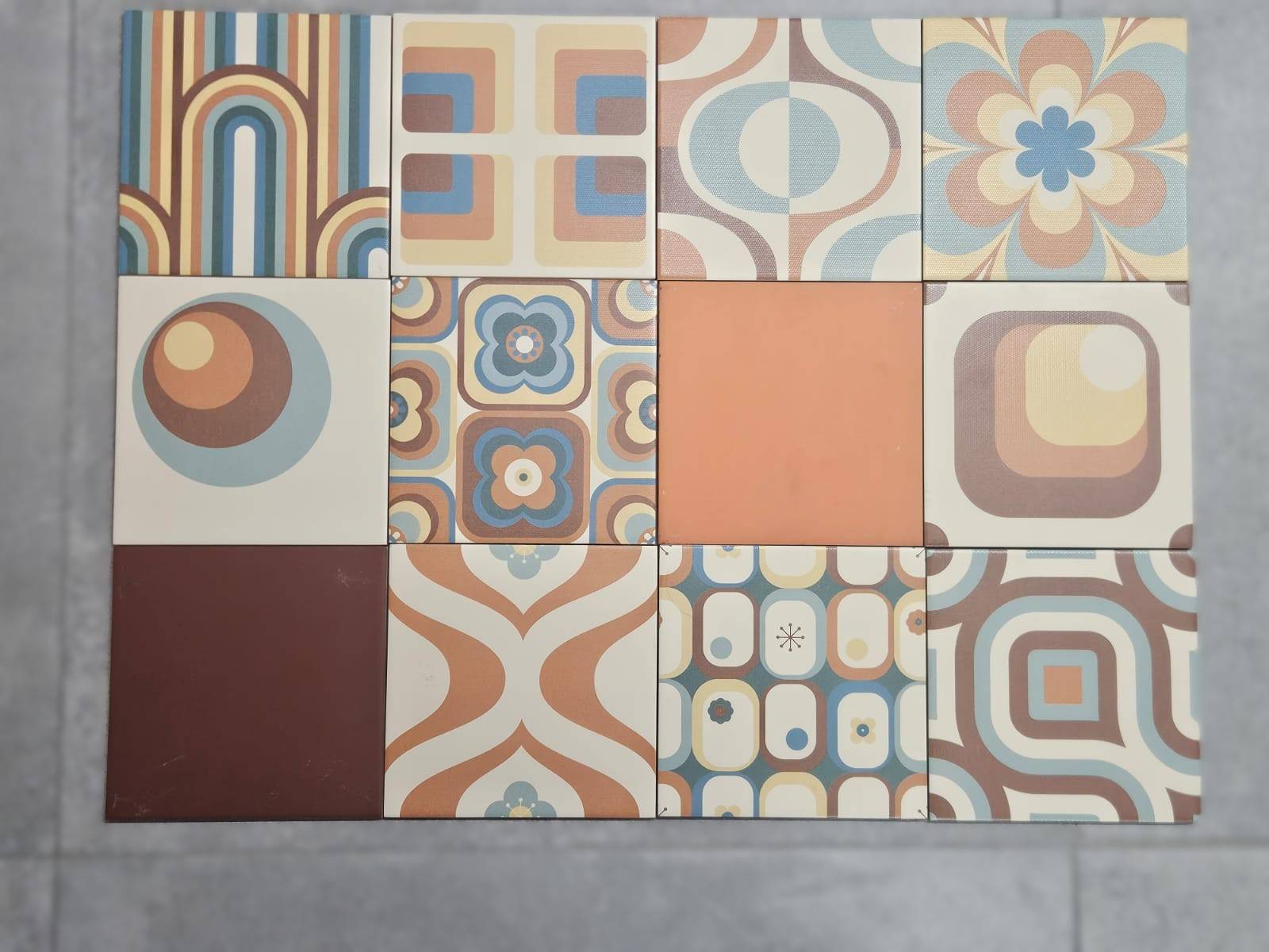 Les carreaux décorés proposent des motifs géométriques et floraux rétro, inspirés de l’univers graphique des années 70, parfaits pour composer des tapis de sol, des murs accentués ou des zones décoratives.