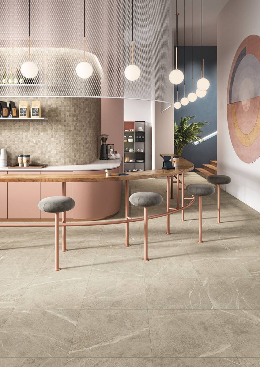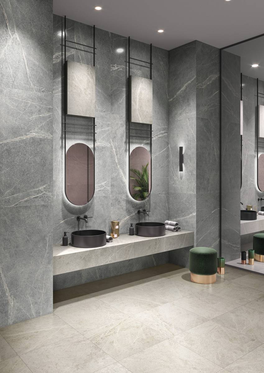 Formats grands carreaux qui facilitent une esthétique continue, avec joints réduits.