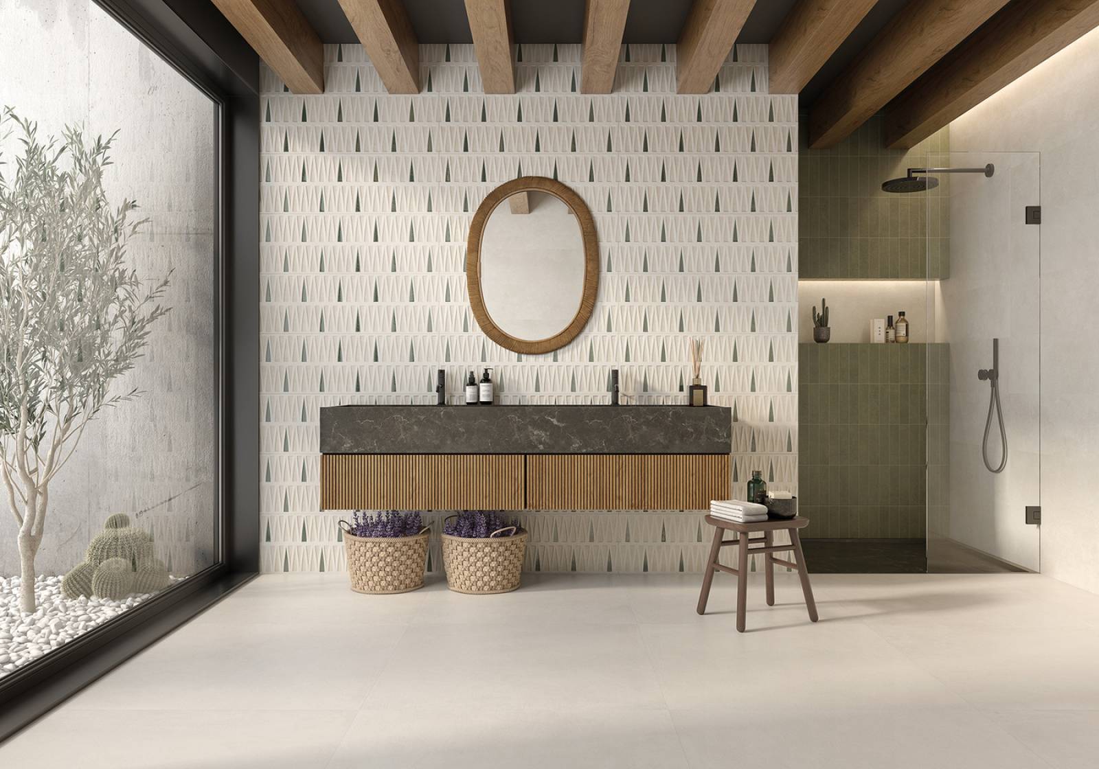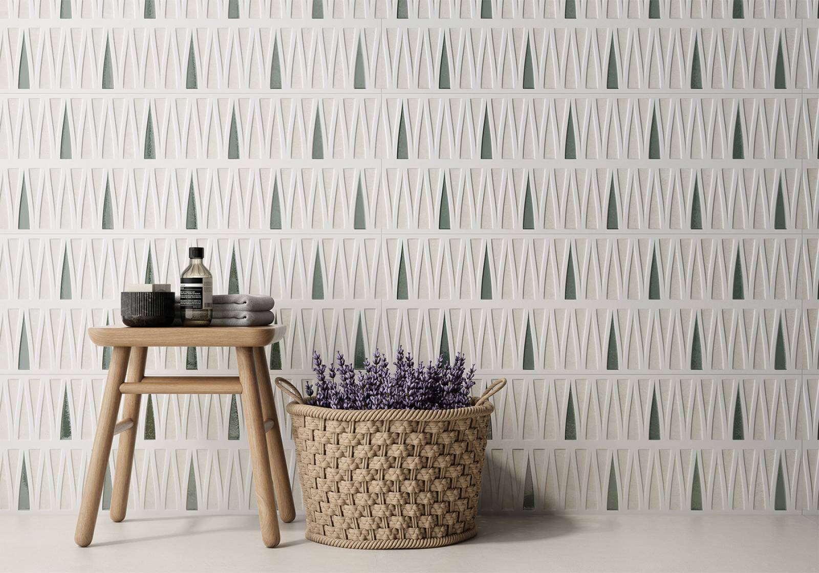 Faïence murale : 30×90 • 30×60 (décor claustra + unis coordonnés)
