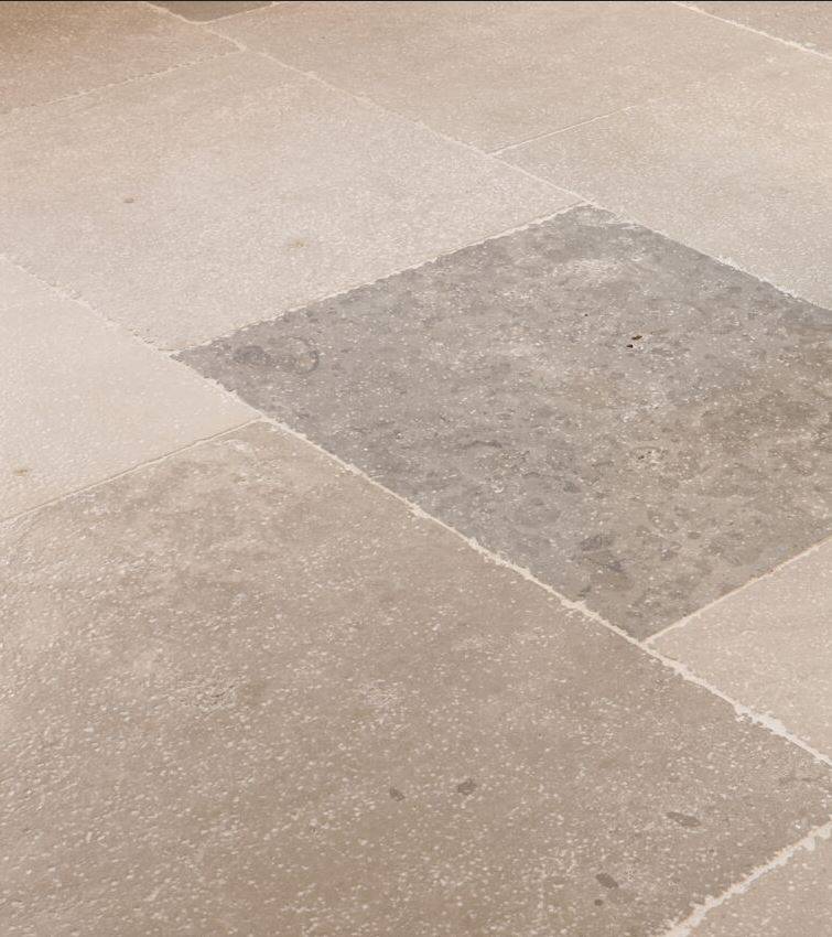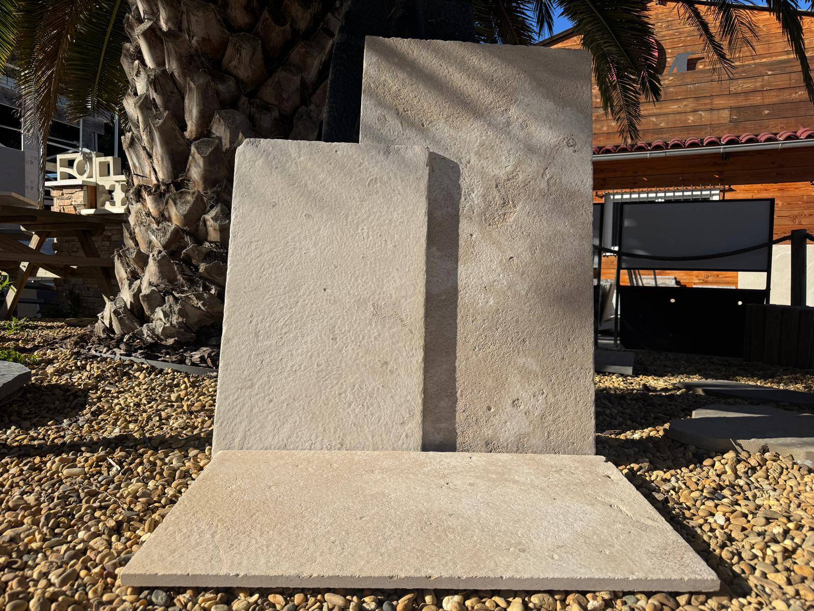 Sa finition vieillie lui confère un caractère unique : arêtes légèrement adoucies, bords irréguliers et surface subtilement ondulée, rappelant l’élégance des pierres anciennes façonnées par le temps.