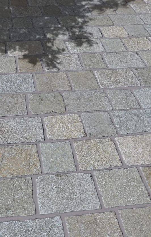 Pavés en pierre naturelle carrossables Marrakech (10 × 10 cm ou 14 × 14 cm) : à poser en joints plus ou moins larges selon l’effet recherché, pour cours et allées carrossables ou piétonnes.